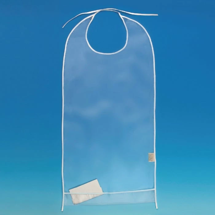 The Clear Bib with Cuff is the ideal clothing protector to prevent and protect against foods and liquids spilling on clothing and dropping to the floor. Easy to clean bib includes a continuous cuff along the bottom that helps catch foods and liquids. Bib measures 18” x 36” and is machine washable.