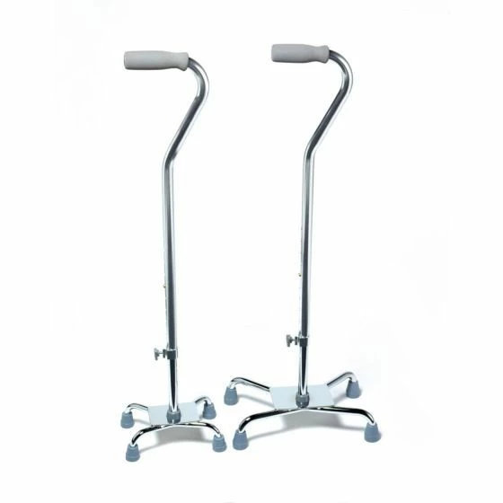 The lightweight quad cane provides reliable support throughout the day. The narrow base quad cane weighs less than two pounds, making it ideal for those who aren’t strong enough to wield a heavier cane. The wide base quad cane is recommended for individuals who need extra stability as they walk. Each support cane’s height can be adjusted to fit any user and uses cane tips to prevent slipping and sliding during use.