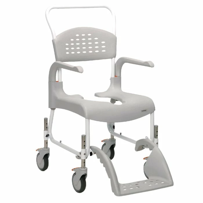 The Etac Height Adjustable Clean Shower Commode Chair features four lockable 5″ casters and can be adjusted to fit over toilets of different heights. The chair adjusts in height from the floor to seat 18 ¾” – 23 ½” in one-inch increments. The brake handles are positioned under the seat, making it easier to reach but not obtrusive enough to interfere with transfers. The seat also has a recess at the front and is fully open at the rear.
