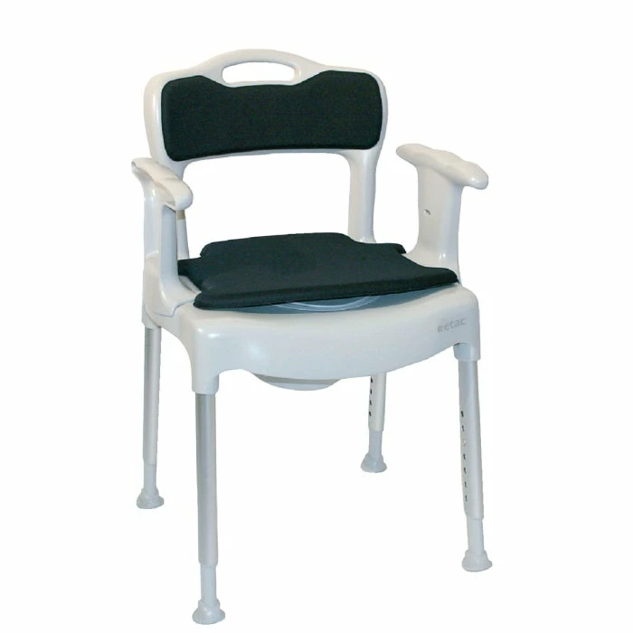 The Etac Swift Commode Chair is a padded chair with a commode opening. The chair easily assembles without the use of tools and is rust-proof for extended use. The chair adjusts to uneven floors to stabilize no matter what surface it’s on.