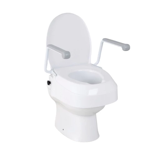 The Raised Toilet Seat with Armrests fosters independence, notably by compensating for impaired movements. This makes it a helpful aid for seniors, people with disabilities, and patients post-hip replacement surgery. Also great as a gift for elderly parents or grandparents. Comes with a lid that can be removed for easy cleaning. The versatile design includes a choice of three fixed seat heights to suit the user.