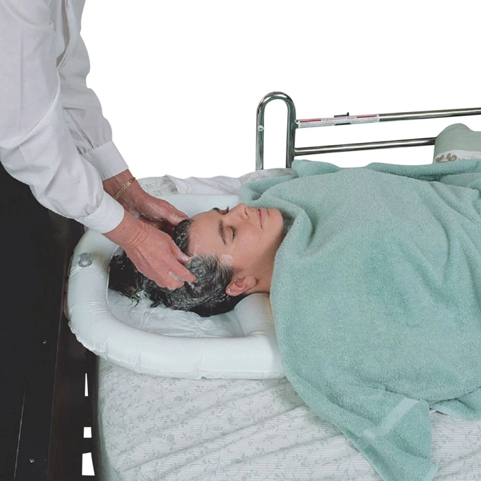 Shampoo Basin easily replaces where the pillow would be when it is time to shampoo and requires no re-positioning of the person. The basin creates an easy to use shampoo station that provides the individual being shampooed with the needed support and comfort. The basin is inflated by mouth that forms a semi-circular ring with neck support. A drain tube is located at the side of the basin for easy drainage. This product folds up easily when not in use and is made of white heat-sealed plastic.