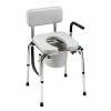 - Additional features include footrests and heel loops, safety strap, insert for solid seat and removable commode pan and pan holder