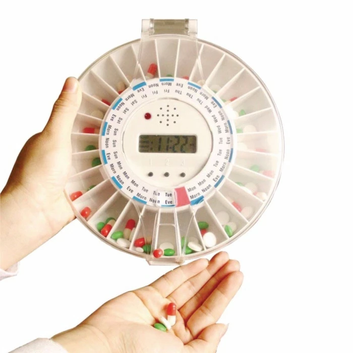 The locking system is designed to help prevent unauthorized tampering. The locking system is activated by a metal key that can be secured in another location if a patient is predisposed to tampering with their medication schedule. Constructed with a transparent lid, this electronic pill organizer allows the patient and caregiver to view both upcoming and past dosages.