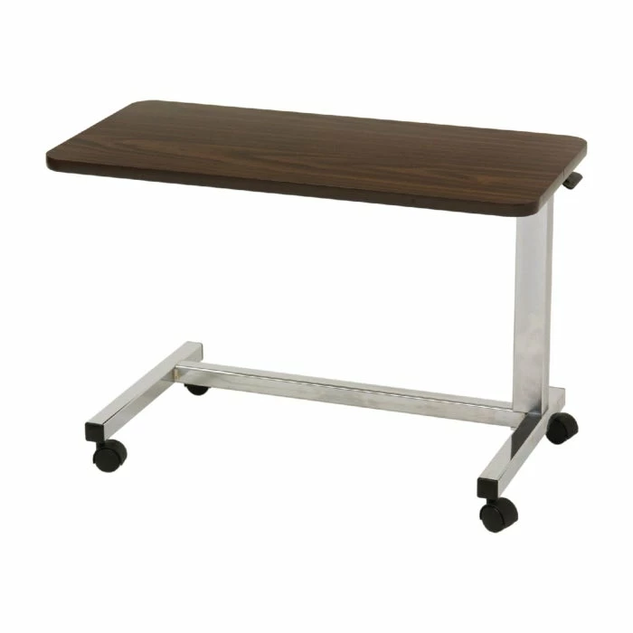 The Low Bed Overbed Table is designed to ruse with fixed height low bed. The top can be raised with the slightest upward pressure and lowers with a touch of the convenient trip lever. There are really infinite adjustments with the spring-assisted lift mechanism. The frame and column are constructed from durable 16 and 17-gauge welded tubular steel and a nice chrome finish. It’s very easy to maneuver.
