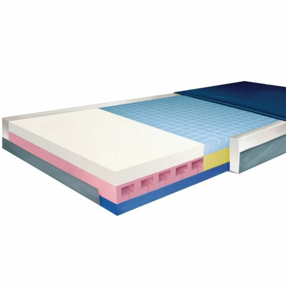 Mattresses feature multilayered pressure reduction mattresses that meet federal fire code CFR 16 part 1633 regulation. The top cover is a four-way stretch nylon to reduce friction and heat buildup. Cover is waterproof and antimicrobial with concealed zipper.
