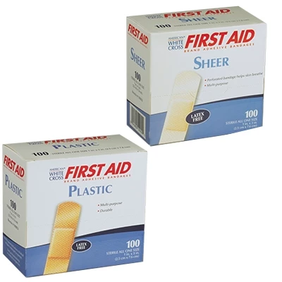 Adhesive bandages aid in keeping out foreign bodies and facilitate the healing process for minor cuts, scrapes, abrasions, and puncture wounds. The Plastic and Sheer Strips are available in several sizes and materials to comfortably fit wounds of different sizes and locations.