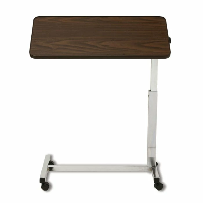 The Tilt Top Overbed Table features fingertip convenience for both height and tilt adjustments. This table can even lay flat along with tilting. The raised T-banding keeps articles in place when the top is tilted. The construction is super durable.