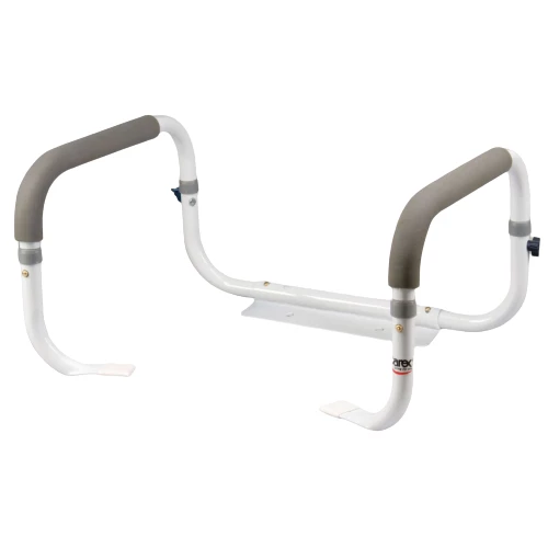 The Toilet Support Rail allows users to safely sit or stand at the toilet. It features comfortable and easy-to-clean Hypalon cushioned grips. The rail is easy to assemble and fits a wide range of toilets and has adjustable hand widths from 16″ to 18″ between arms. The Toilet Support Rail has a 300 lb weight capacity and comes in an attractive retail packaging.