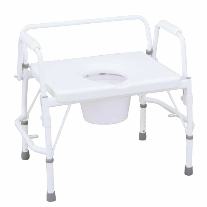 This bariatric commode features an easy-to-release arm mechanism to allow for safe lateral patient transfers to and from commode. The commode can be used at a patient’s bedside as a toilet safety frame or as a raised toilet. Constructed of a welded polyester-coated steel frame that is sturdy and durable enough to support up to 700 lbs. The rubber ferrules at the bottom of each leg provide added stability and prevents the chair from moving on slippery surfaces.